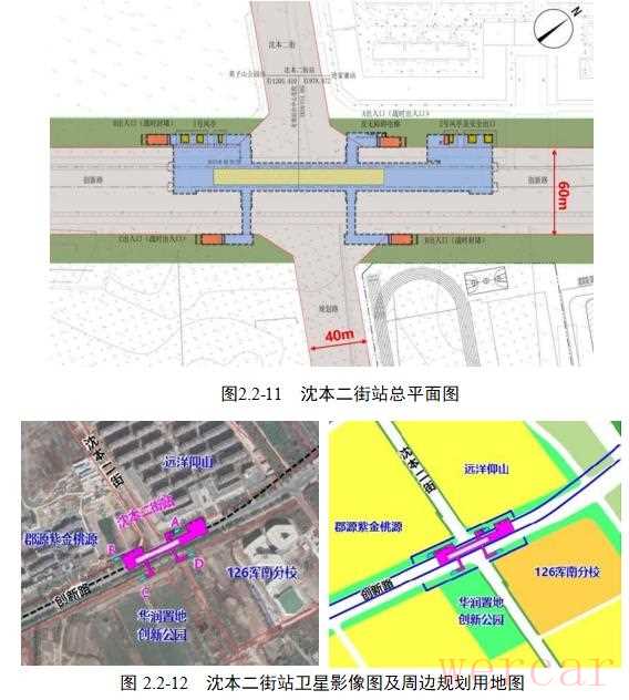 沈本二街站是本工程的第5座车站,车站跨创新路与沈本二街路口设置。路口周边以住宅及教育用地为主,东北角为远洋仰山,西北角为郡源紫金桃园,西南角为华润置地润溪山,东南角为126中学浑南分校。站位周边规划以居住用地、中小学用地、绿地为主,现已部分实现规划。