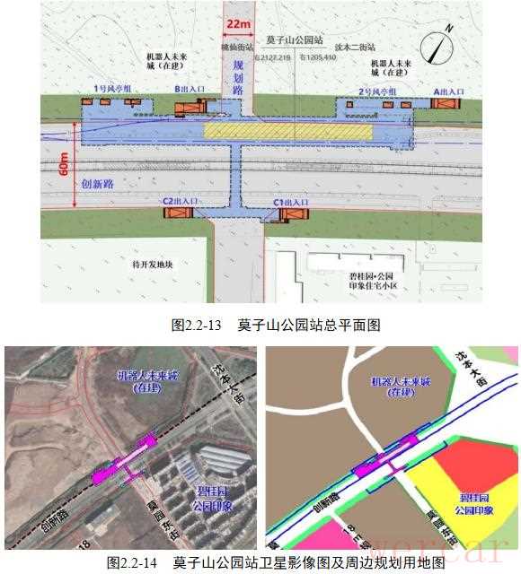 莫子山公园站是本工程的第6座车站,站位区域靠近莫子山公园。车站跨创新路与规划莫园东街交叉口设置。站位所处路口北侧为机器人未来城产业园区,路口东南角为碧桂园公园印象住宅小区,西南角为待开发用地。创新路路中敷设有有轨电车6号线。站位周边规划以以工业用地、居住用地为主,尚未实现规划。