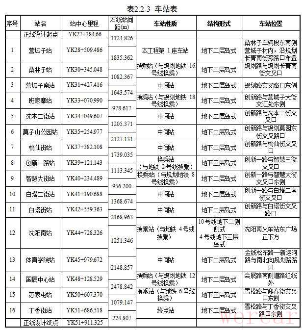 共设车站16 座,均为地下车站,共有换乘站 7 座,平均站间距约1.48km。其中沈阳南站及与其衔接的部分区间土建工程已作为高铁站沈阳南站的配套工程先期实施。