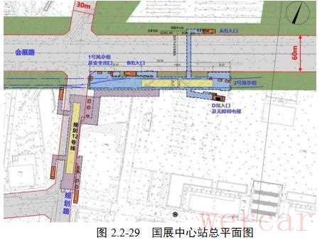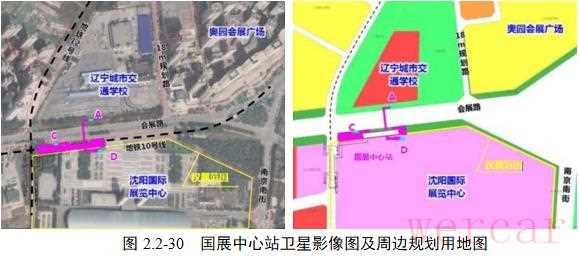 国展中心站是本线的第14座车站,线路沿会展路由东向西走行,与远期12号线换乘。车站设置在会展路南侧道路红线外,沈阳国际展览中心广场北侧地块内。用地周边规划有文化设施用地、城市绿地、商业及居住用地,站位南侧为沈阳国际会展中心, 建筑距车站约200米,站位东南侧为既有有轨电车 1 号线终点站。站位北侧为辽宁城市交通学校, 站位周边已形成规划。