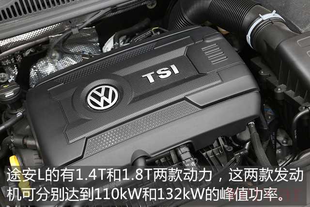 途安L搭载了1.4TSI和1.8TSI两款发动机。1.4TSI发动机配合7挡双离合变速器可以达到110kW的最大功率和250N•m的峰值扭矩。而1.8TSI的发动机可达到132kW的最大功率和300N•m的峰值扭矩。