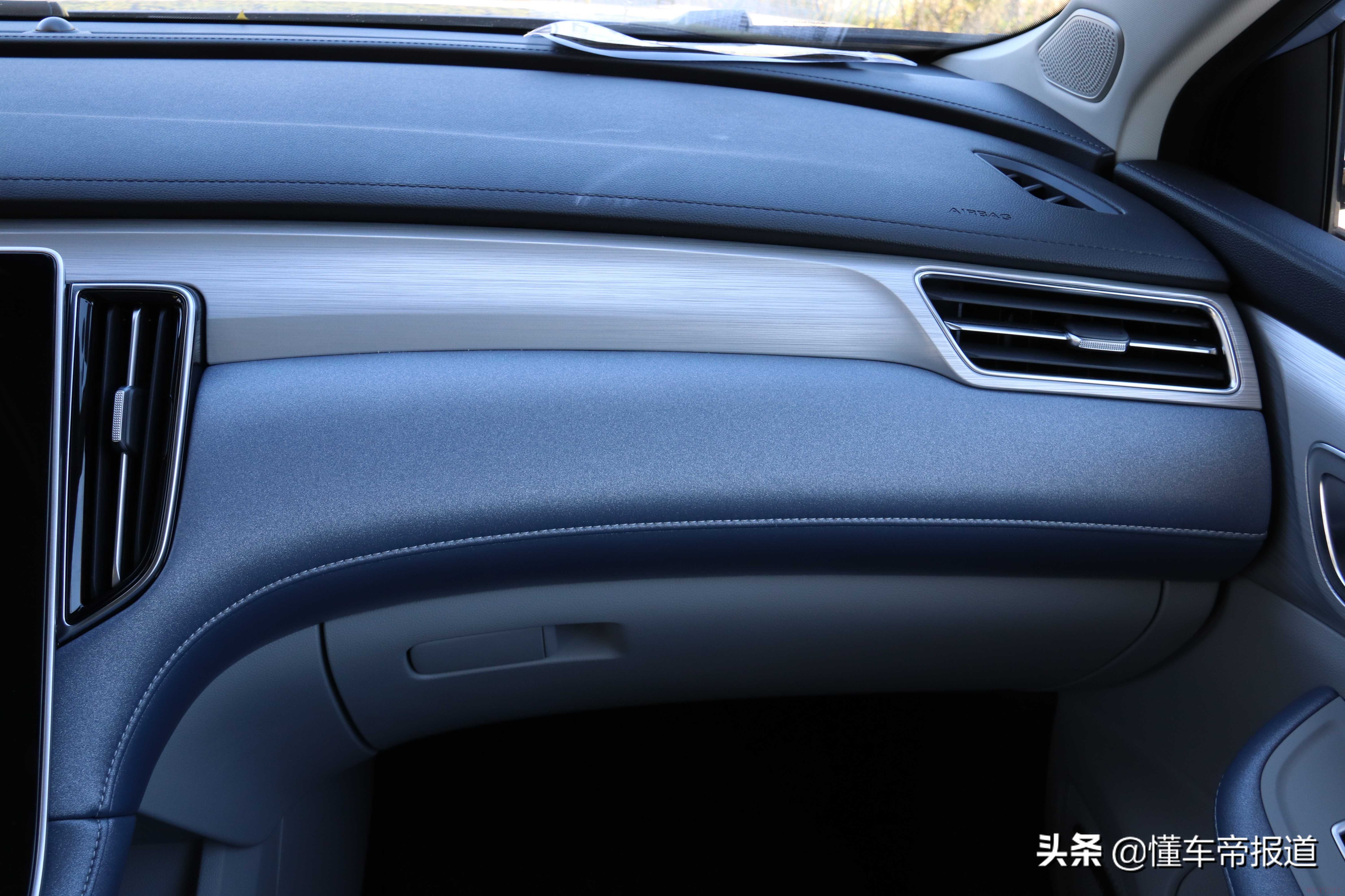 用料方面,车内以蓝/白配色为主,并且大面积使用软质包裹,触感丝滑有一定的档次感,车内还有金属拉丝面板以及镀铬装饰和钢琴烤漆面板等材质点缀,丰富层次感的同时,几种材质之间相互搭配,更是显得相得益彰。