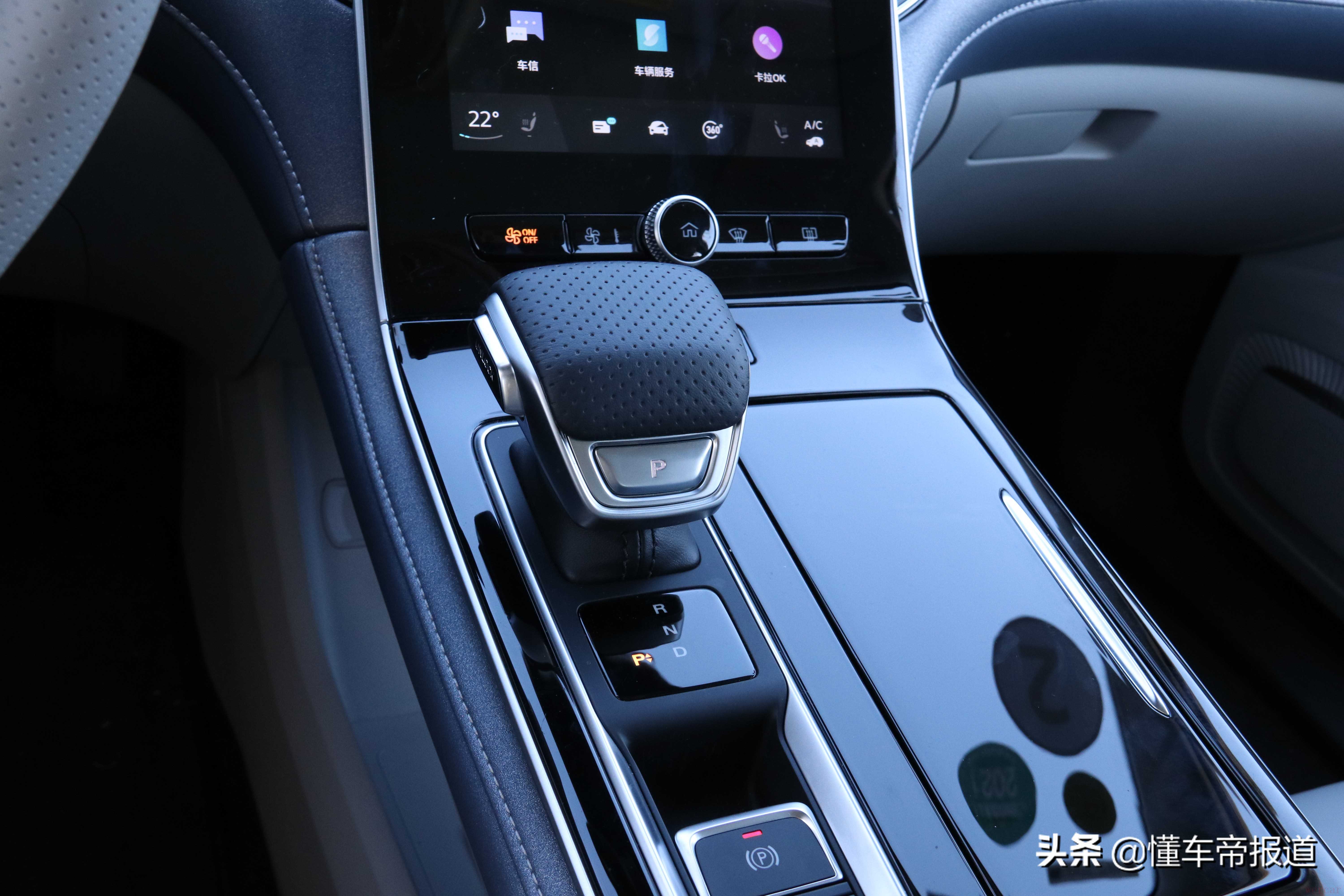 新车采用电子挡杆设计,尺寸十分小巧,握感比较饱满,上方还采用打孔真皮包裹,整体质感十分出色,并且得益于体积的缩小,下方留出了一个掏空的储物空间,配备了两个充电接口,实用性得到大大提升。