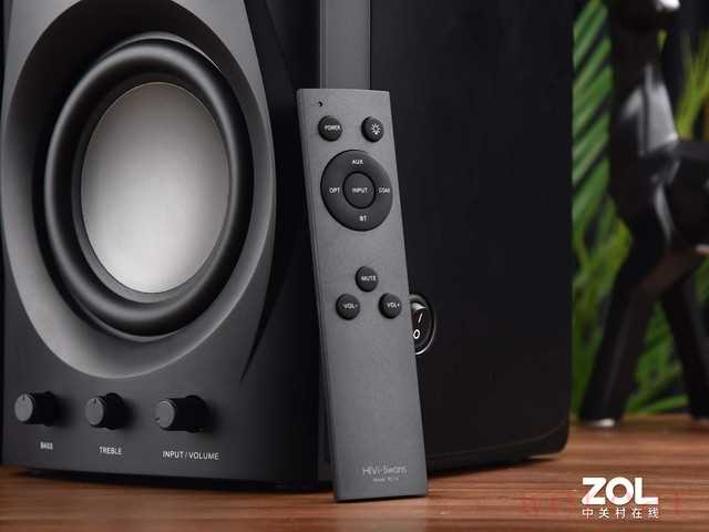 大家应该也注意到了,C1200采用的是前置调节旋钮,其实我自己是很喜欢前置旋钮的,更方便近距离听音时操控调节增益、音量、切换输入模式等。当然,更方便的方法还是用遥控器了,C1200配备的遥控器可以让你在沙发和床上轻松操控音箱,同样很方便。
