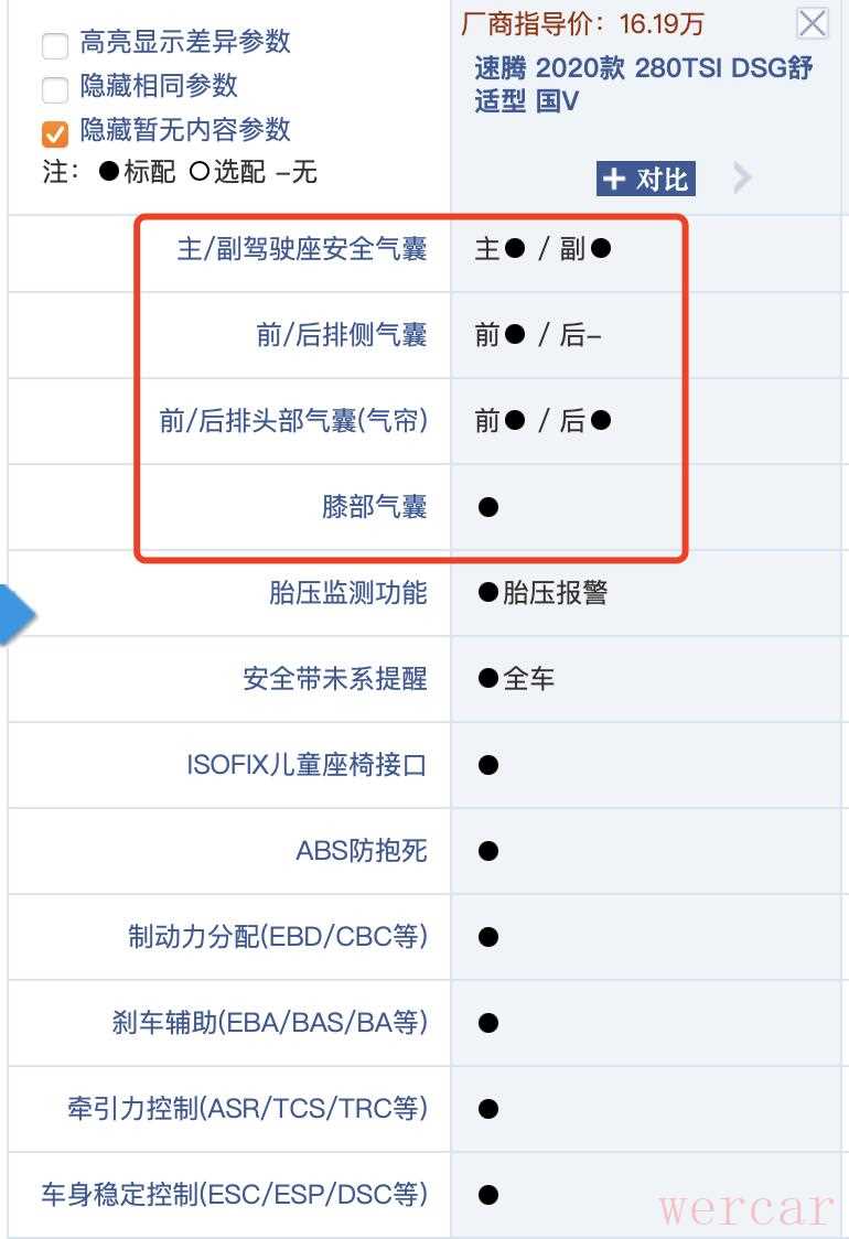 "优点:" 速腾配备了多个安全气囊,包括前排正面安全气囊、侧面安全气囊(