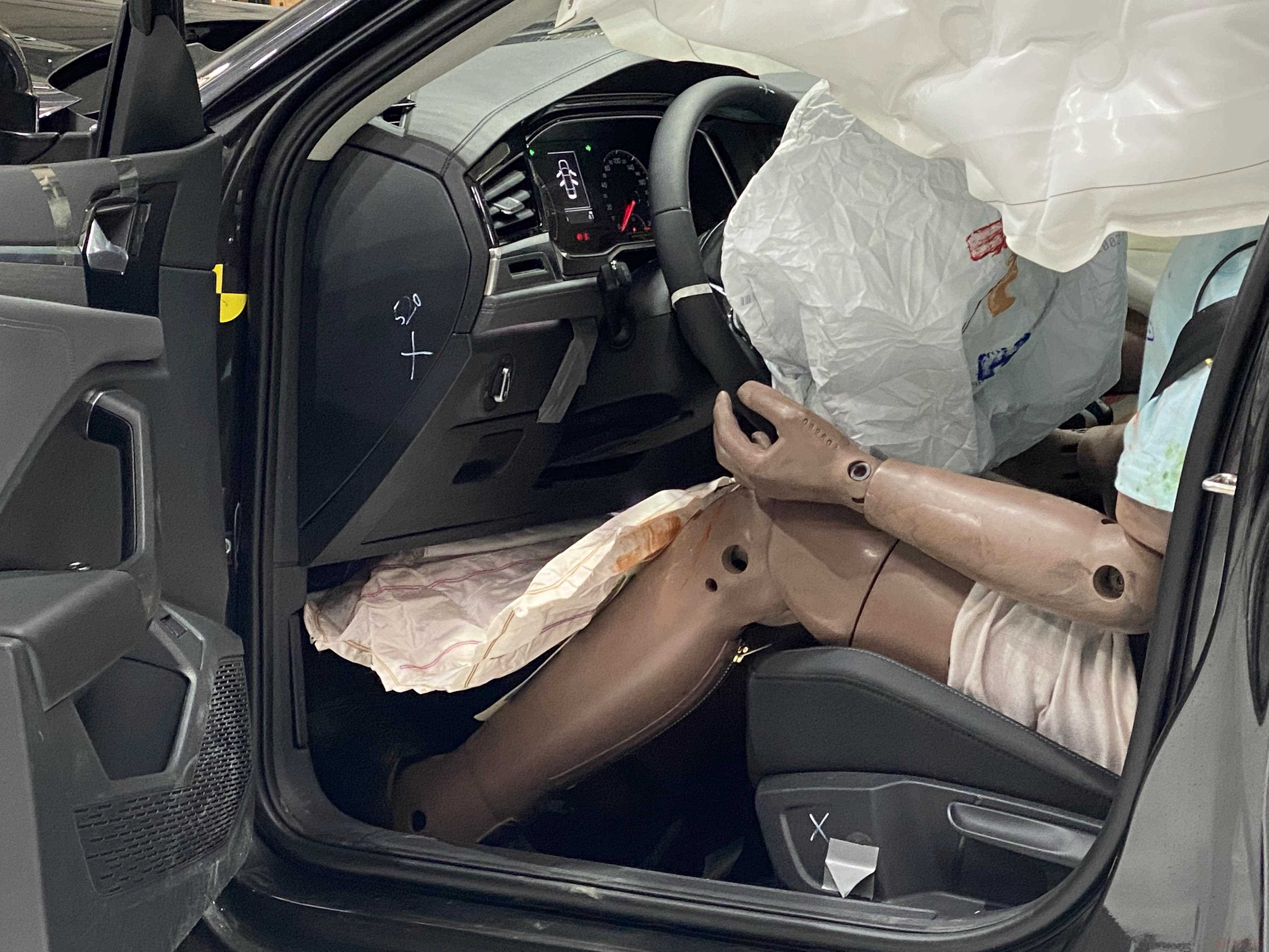 车内前后排假人姿态保持不错,安全带在撞击力下束缚有效。其中主驾驶假人腿部有气囊保护,副驾驶假人腿部也没有与手套箱出现明显的擦碰痕迹。后排假人头部位于车内出现擦碰痕迹。