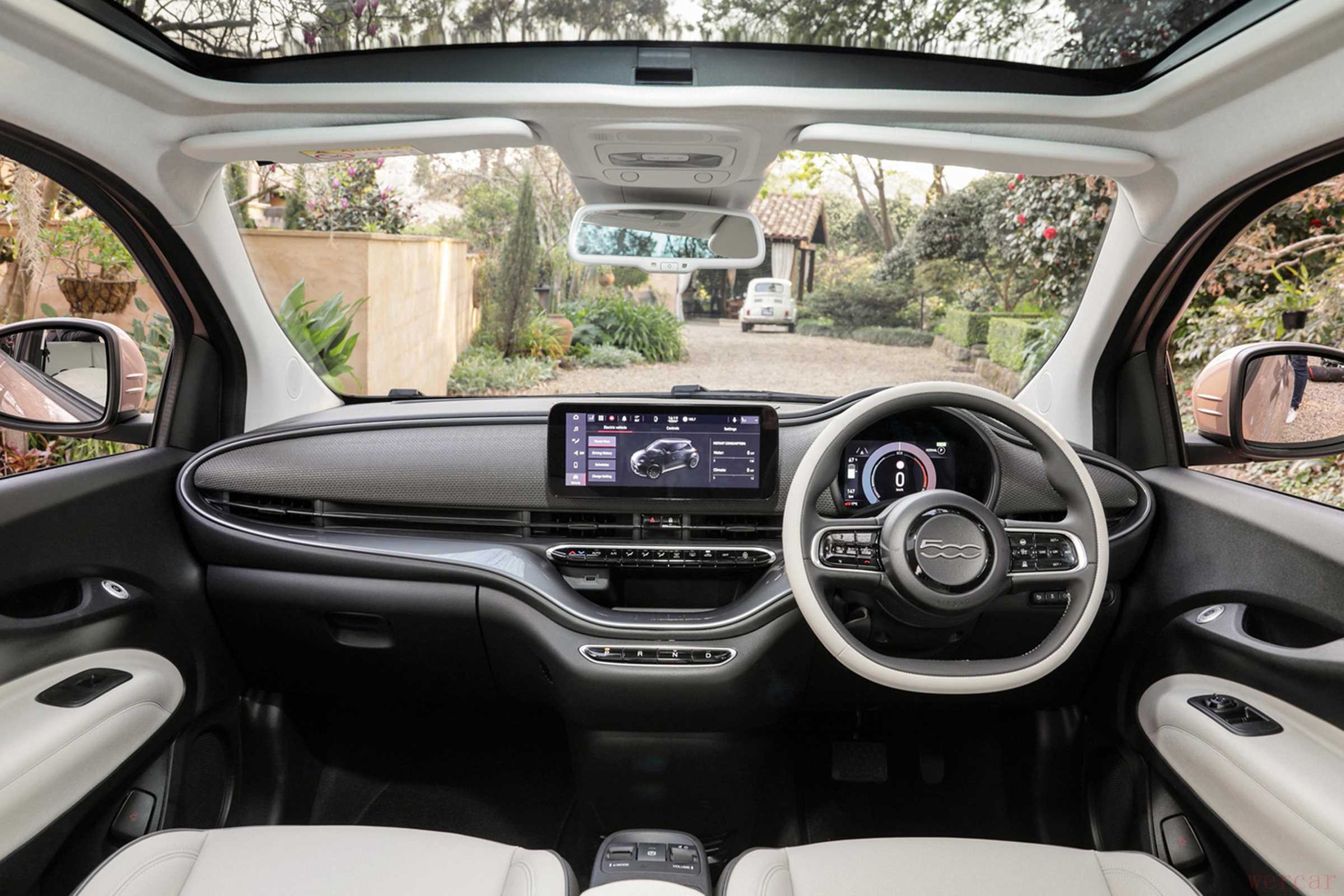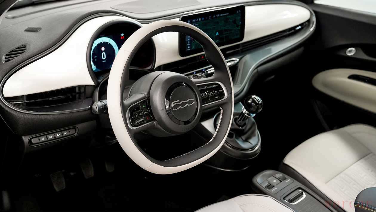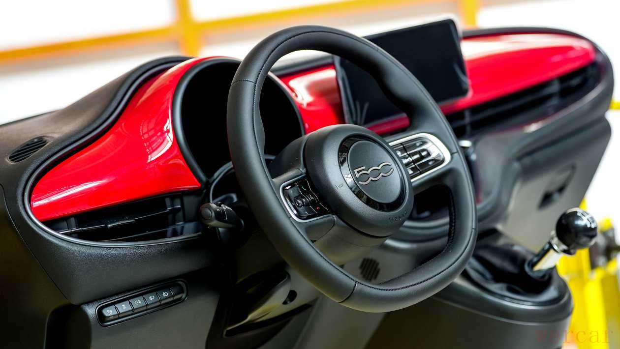 内饰方面,菲亚特500混动版继续配备10.25英寸中控屏、7英寸仪表盘,可以支持无线苹果CarPlay以及安卓Auto手机互联。另外,该车还配备驾驶辅助功能,可以支持车道保持、交通标志识别等L2级驾驶辅助功能。菲亚特500混动版由于采用了6挡手动变速箱,因此副仪表台布局会和纯电版有所区别。