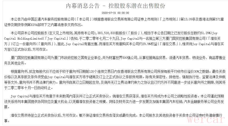 面对财务危机,正通汽车正在积极自救。7月31日,正通汽车发布公告称,控股股东有意溢价出售公司29.9%的股份,接盘方为由厦门市政府100%控股的国有企业——厦门国贸控股集团有限公司。不过,正通汽车在公告中表示,此次交易须待签立正式买卖协议后方可坐实。这意味着,双方的股权交易也有可能存在变数。