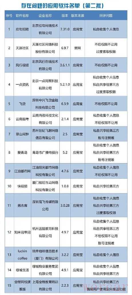 南都讯见习记者陈菁钰实习生柯岱宏1月8日,工信部通报第二批侵害用户权益行为APP,拉勾招聘、天涯社区、风行视频、一点资讯、luckin coffee等15款应用在列。根据通报,以下APP应在2020年1月17日前完成整改落实工作,逾期不整改的,工信部将依法依规组织开展相关处置工作。