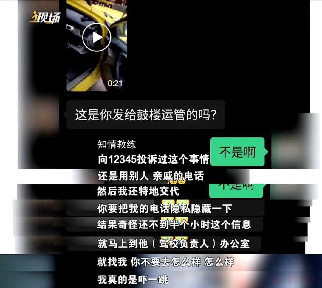 没按照规范打学时培训,学员没有充分的时间实操练车,引发了学员和教练之间的矛盾。有的教练就将违规打学时的视频拍下向主管部门投诉,但是知情教练说,驾校负责人很快就会知道是哪个教练投诉的。在安康达驾校一位负责人和一位教练的微信聊天记录上是这么写的:这是你发给鼓楼运管的吗?运管说是陈教练。