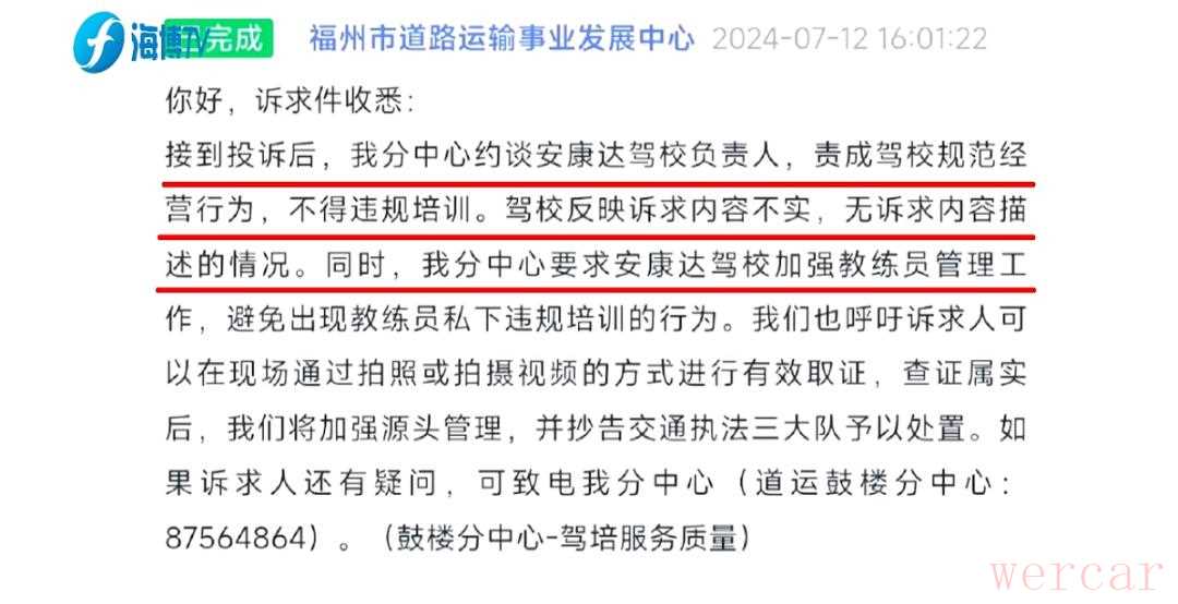 对于近一段时间用视频打学时,也有其他教练向12345平台投诉,投诉件中说,教练通知学员录视频打虚假学时,严重侵害了学员利益,压榨学员练车时长。无视驾校规章制度,是驾校的指使?还是有关部门的包庇?望主管部门严查,诉求件上还附上了证据图片。7月2日,福州市道路运输事业发展中心回复件上写着,接到投诉后,我分中心约谈安康达驾校负责人,责成驾校规范经营行为,不得违规培训。驾校反映诉求内容不实,无诉求内容所述的情况。对于这样的回复,知情教练说他感到十分疑惑。