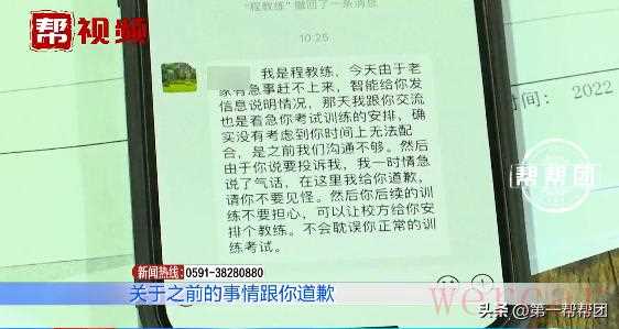 调解小组来到了福州康达驾校,虽程教练不在,但记者见到了驾校相关负责人。其表示,教练与小雍在沟通中的确存在误会,作为校方没有及时介入,导致矛盾扩大,深感歉意。