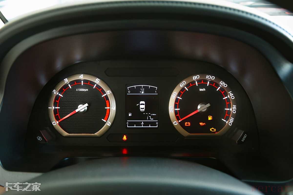 仪表盘采用了简单的双圆造型,背景光颜色较为鲜亮,读取数据时较为轻松,仪表中央是一块单色行车电脑屏幕,油量表和水温表也集成于此。