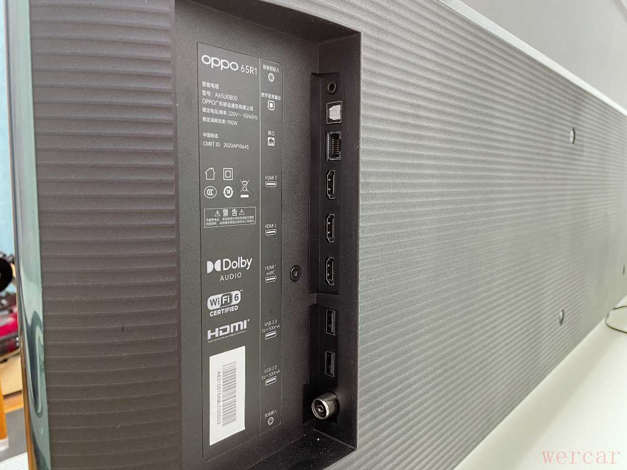后背部分,则是微微有弧度的主机,背面左侧分布着丰富的接口,这个设计就不得不提人性化了,离边框只有半只手的距离,可以轻松触及到,非常人性化。而行业里一些采用模板化生产的产品,接口部分都极其不友好。OPPO智能电视R1的接口包括了天线输入、USBx2、HDMIx3(均支持HDMI2.1,其中HDMI1支持eARC)、网口、数字音频输出、音视频输入,基本覆盖了我们日常使用的全部!