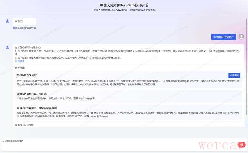 人民大学人工智能专业怎么样?如何开具在学证明?……开学首日,人民大学e问e答服务平台正式接入DeepSeek-R1,在北京高校中率先本地化部署该AI大模型,帮助师生一键解决各类需求。全新升级后的平台,不仅可以自如校内服务相关的1300余条标准问题,还支持校园办公自动化、科研项目辅助、学术资源分析等多领域应用,提供信息查询、对话交流、知识问答等服务。
