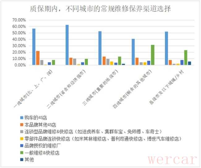 调查数据显示,质保期外的维修保养,除一线城市以外,一般维修&快修店取代购车 4S 店成为了各级别城市最受欢迎的维保渠道;在二线城市,选择连锁型品牌维修&快修店的受访者更是超过了选择购车4S店的受访者,占比达到了 22.5%。
