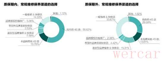 总体来看,过了质保期,更多的受访者愿意去连锁型品牌维修店和一般维修&快修店做常规维修保养,这两项占比接近五成。而质保期内在4S店做维修保养的受访者中,更是有 35.63% 会在质保期后离开4S店,选择其他渠道。