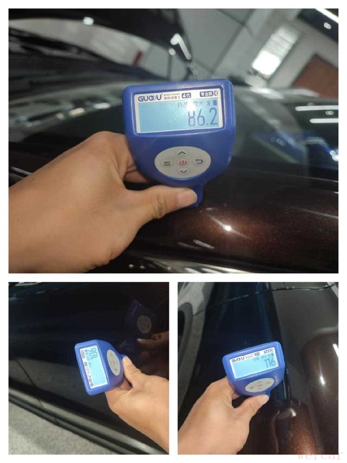 接下来是检测全车的漆面情况,可以看到整车的漆面分布均匀,没有重新做过喷漆修复,所以这辆车确实都是原版原漆,在这一点上卖家确实没有说谎。看来原车主的驾驶技术也不错,五年下来全车都没有什么擦挂。