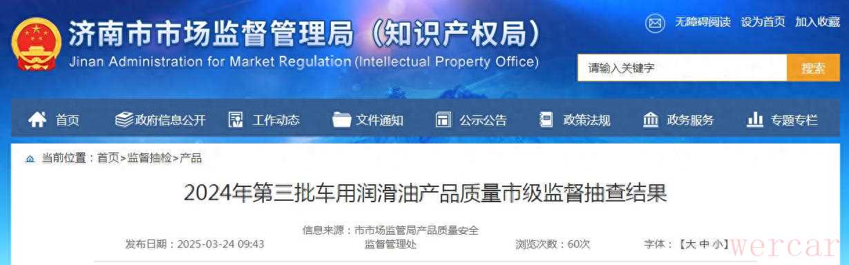 1. "访问济南市市场监督管理局官方网站":查找“政务公开”、“通知公告”或“质量监督”等栏目,搜索“2024年第三批车用润滑油产品质量监督抽查结果”或类似关键词。