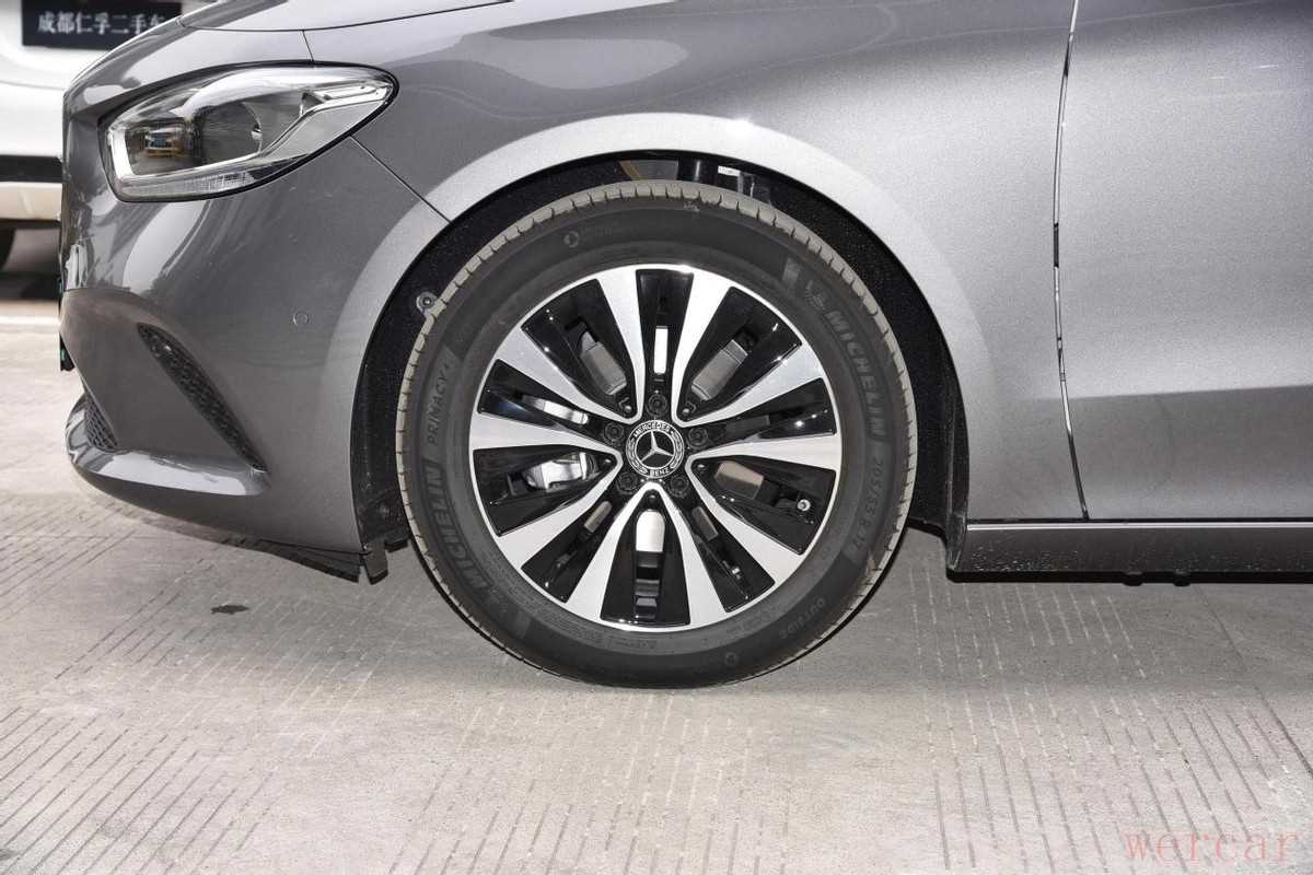 来到车身侧面,作为一款多功能的旅行车,整台车显得较为圆润敦实,上下两条腰线也使得这款车更加动感。轮圈是双五辐的结构,并且在细节部分做成双拼色,前后轮胎规格统一为205/55 R17,放在奔驰B级并不会显得小气。