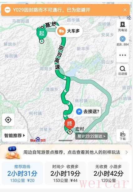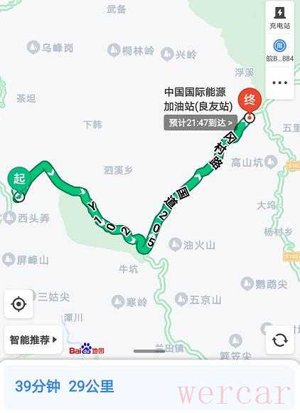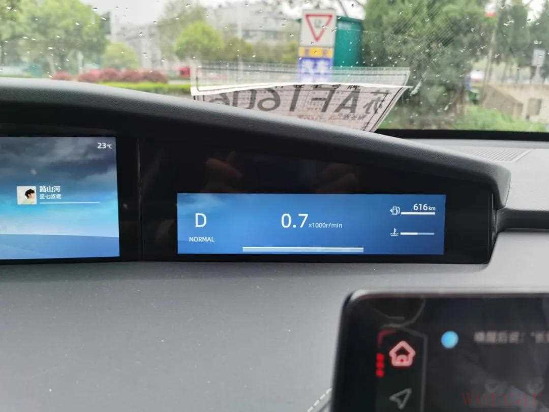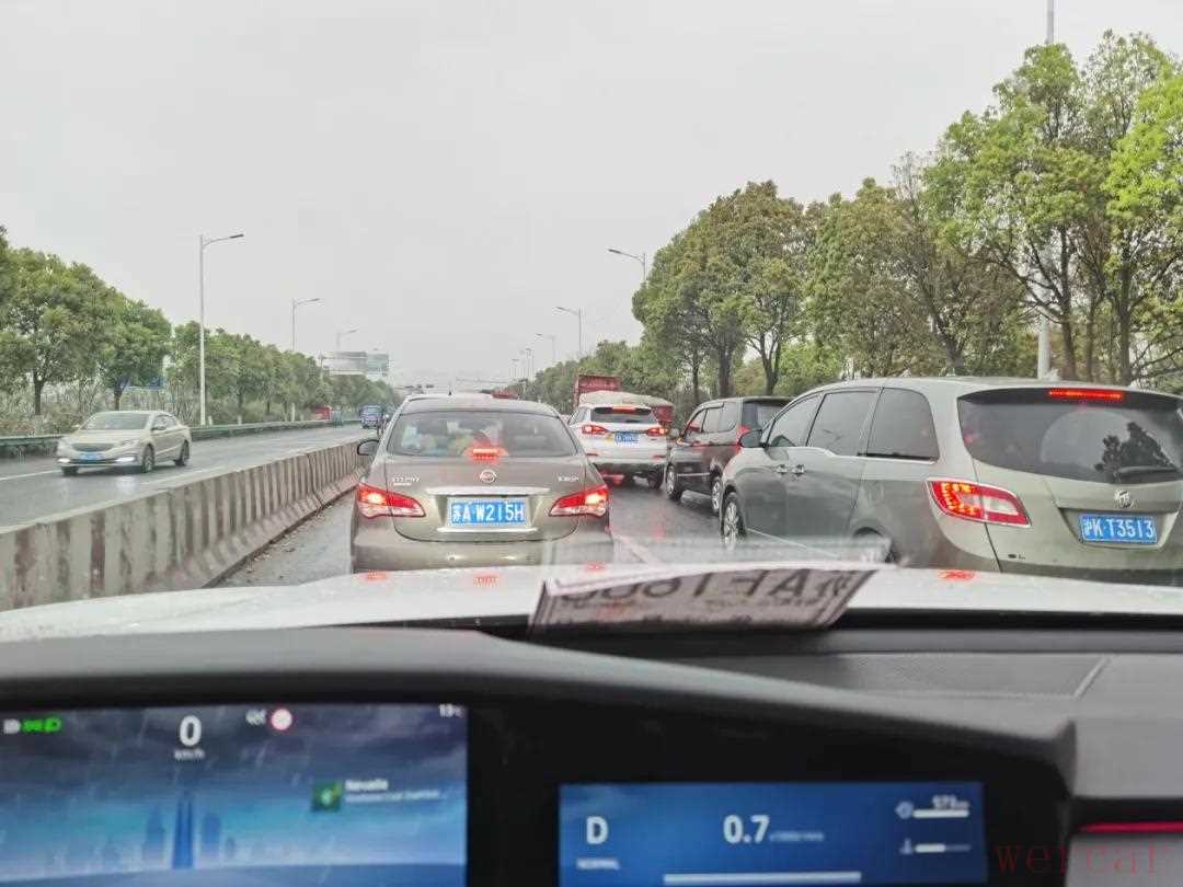 出发前加满油,加油站距第一个目的地134km,路上红绿灯和大车较多,路况没有想象中那么通畅,加之下雨和限速,整个路程的行车速度基本维持在50-60km/h之间,全程采用NORMAL模式行驶。