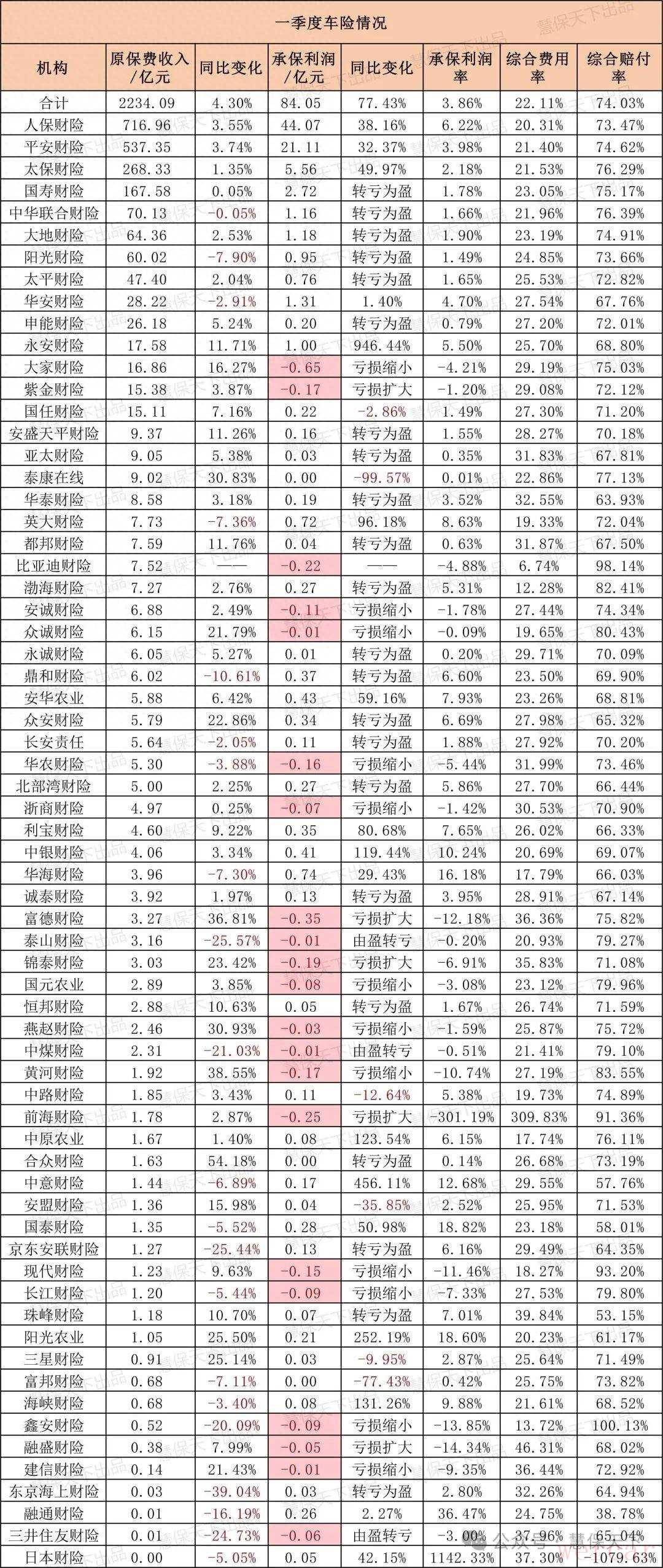 一季度的车险业可以直呼叫好!从行业整体来看,不仅保费增长保持稳健,较去年同期增长4.29%,达2234.09亿元,承保利润更是同比大增77%至84.05亿元,承保利润率也普遍提升。对于具体公司也同样,向好态势明显,尤其是22家较之去年同期实现转亏为盈。这或许是对此前财险业越过“跑马圈地”、基本迈入高质量发展的新阶段的印证。但若深入来看,数据表现一片大好之下个体分化也十分激烈,尤其是在老三家“稳坐钓鱼台”下,其他公司的厮杀仍十分激烈,例如,比亚迪财险以“股东爸爸”的禀赋优势直接带来行业最低、仅个位数的费用水平,而其他体量更小的中小险企毫无疑问有着更大压力。更令人忧心的,是如何获取未来的增长,虽然大家目前都对新能源车险承保亏损感到为难,但这确实也是当前车险市场增速最高的领域,而在这一领域,头部公司的优势正压倒性展示出来。01一季度车险承保盈利大增,人保财险利润率远高于行业,中小险企分化激烈车险占比虽然逐渐下降,但仍是财产险公司的基本盘,车险贡献了一半以上的保费收入,并且从盈利角度看,车险承保利润是财险业务承保端盈利的主要来源。而今年一季度的数据,正是对此的很好展示,数据显示,一季度车险行业原保费收入达2234.09亿元,同比增长4.29%,增速较2024全年有所上扬;实现承保利润84.05亿元,同比增长77.43%,优于财险业整体净利润增长水平;行业承保利润率3.86%。其中,“老三家”仍占据行业绝对主导地位,老三家保费收入合计1522.64亿元,占比68.15%,承保利润70.74亿元,占比84.16%。具体来看,人保财险、平安产险、太保产险分别实现车险保费收入716.96亿元、537.35亿元、268.33亿元,分别同比增长3.55%、3.74%、1.35%。更值得关注的是老三家的承保盈利,人保财险、平安产险、太保产险分别实现44.07亿元、21.11亿元、5.56亿元,分别同比增长38.16%、32.37%、49.97%,承保利润率分别为6.22%、3.98%、2.18%。其中,人保财险6.22%的承保利润率虽不是所有公司中最高的,但也远高于行业水平,结合其行业龙头的巨大体量,所以能以行业三分之一的保费收入实现超过行业一半的承保利润。头部相对“岁月静好”,而中小险企的分化更为激烈。一方面,部分公司保费增长相当迅猛,有众安财险(同比增长22.86%)、泰康在线(同比增长30.83%)等互联网保险公司;也有合众财险(同比增长54.18%)、众诚财险(同比增长21.79%)等汽车系保险公司;此外还有大家财险(同比增长16.27%)、富德财险(同比+36.81%)等公司也增长亮眼。另一方面,也有部分公司市场规模大幅缩水,例如泰山财险同比下滑25.57%、中煤财险同比下滑21.03%、三井住友财险同比下滑24.73%,这三家也是66家公司中唯三承保利润由盈转亏的公司。虽然今年承保盈利情况大幅好转,但一季度仍有21家承保利润为负,占比超30%,综合来看,这些公司的综合费用率普遍高于25%,成本控制能力有待加强。