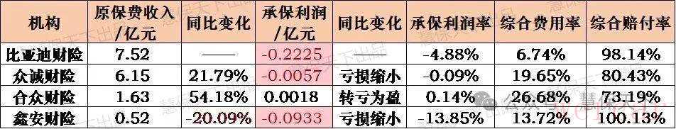 虽然比亚迪财险由于去年5月才开业,没有同期对比数据,但其快速上升的排名,也足以看到其增速之猛烈。目前,比亚迪财险已经位列车险榜单第22名,直接跻身行业前三分之一,而这只是其在7个省份开展业务创下的成绩单。比亚迪车险业务的增长,或许与其作为新能源龙头车企的天然优势分不开,尤其是其目前仍在快速增长。数据显示,2025年第一季度,比亚迪股份实现营业收入1703.6亿元,较上年同期增长36.35%;净利润为91.55亿元,同比增长100.38%。根据2024年年报,比亚迪实现营业收入7771亿元,同比增长29%;净利润402.5亿元,同比增长34%。其中,汽车、汽车相关产品及其他产品业务的收入约6173亿元,同比增长27.70%而也正是这一天然优势,给比亚迪财险带来了全行业最低的费用率水平,不仅是远低于行业平均水平22.11%,还低于其他汽车系险企,更是直接达到了前所未有的个位数水平,仅有6.74%。当然,这得益于比亚迪财险不用支付额外的渠道费用,其一季度偿付能力报告显示,其7.5亿元的签单保费均来自于直销渠道,车均保费为4300元,较其首份偿付能力报告重点4900元已有所下降。另外的几家公司,也都较去年同期实现明显好转,众诚财险、合众财险车险保费分别同比增长21.79%、54.18%,鑫安财险虽然是负增长,但较之2024年同期57%的降幅已有明显收窄。除开保费高速增长,汽车系险企另一明显特征就是承保亏损,四家公司仅合众财险实现17.77万的微利,其他三家公司均仍处于承保亏损中,比亚迪财险、众诚财险、鑫安财险分别承保亏损0.2225亿元、0.0057亿元、0.0933亿元。但更重要的是好转趋势,与去年同期相比,这些公司要么转亏为盈,要么已经明显亏损缩窄。03费用控制、大灾减少助力车险承保盈利大增,新能源车险是未来增长重点作为保持比较稳定的发展速度的成熟业务市场,车险市场格局较为稳定。但大涨的承保利润还是令人欣喜。综合分析,主要有以下两大原因:一是监管引领下恶性竞争减少,费用成本得到有效控制,尤其是在2024年3月监管提出实行三项监管工作机制(检查机制、通报机制、挂钩机制)、全面强化“报行合一”后,在保险业协会组织启动行业自律下,全行业的费用水平不断下降。从数据变化也可以看到,2024年一季度车险全行业的综合费用率为23.89%,今年一季度只有22.11%。二是“老天爷赏饭吃”,今年一季度国内重大自然灾害损失同比明显减少,也助力于大额的赔付情况减少。据应急管理部数据,2024年一季度各种自然灾害共造成全国26个省(自治区、直辖市)1037.9万人次不同程度受灾,直接经济损失237.6亿元;而2025年一季度各种自然灾害共造成120.4万人次不同程度受灾,直接经济损失101.6亿元。两项叠加,行业的综合成本率得到控制,也就使得承保利润提升。但21家承保亏损的险企也发出提示,平稳发展也并非易事,尤其是行业转型之下,资源与能力的双重考验摆在每一个公司面前,更需要找到真正的发力点,以及属于自己的可行性道路。而从各种信息中可以看到,高速增长点落在了新能源车险上。据报道,有业内数据显示,今年一季度新能源商业车险签单保费超314亿元,同比增长44%。同时,有效报案件数36.3%的同比增速低于保费增幅,折射出技术进步等因素带来的风险改善趋势。这得益于仍在高速增长的新能源汽车销量,据中国汽车工业协会数据,2025年一季度,我国汽车产销累计完成756.1万辆和747万辆,同比分别增长14.5%和11.2%,其中新能源汽车产销分别增长50.4%和47.1%,新能源汽车新车销量占汽车新车总销量的比例达到41.2%,成为市场增长的核心驱动力。毫无疑问,在新能源车渗透率不断提升之下,未来其将成为车险市场的重要贡献来源。从2024年的行业整体数据来看,保险行业承保新能源汽车3105万辆,保费收入1409亿元;整体车险保费9137亿元,新能源车车险占比15.4%。加之今年1月,为了系统性解决新能源车险消费者喊贵、保险公司喊亏等难题,金融监管总局等4部门联合发布了《关于深化改革加强监管促进新能源车险高质量发展的指导意见》,紧随其后,保险业协会、上海保交所也推出“车险好投保”平台新能源车投保难问题。行业层面的实际发展和政策利好之外,头部公司的具体实践也证明了这一领域发展的切实可行性——人保财险2024年新能源家自车保费收入508.57亿元,同比大增58.7%,综合成本率低于100%实现盈利。这当然与人保财险的龙头地位分不开,其2024年承保新能源车量1159万辆,同比大幅提升57.3%,承保数量占到全行业的37.32%。大量的数据有助于人保财险提升新能源车定价的精确性,再通过大规模的风险分摊摊薄成本进而实现盈利。但从另一个角度考虑,新能源车险的发展,或许是车险行业马太效应进一步演化的增强器,与中小险企相比,头部险企的技术、资本、数据三重壁垒难以跨越,头部险企的市场份额或将进一步扩大。对于中小险企来说,精细化管控成本,将费用降下去或许是更为直接也更为可行的道路。