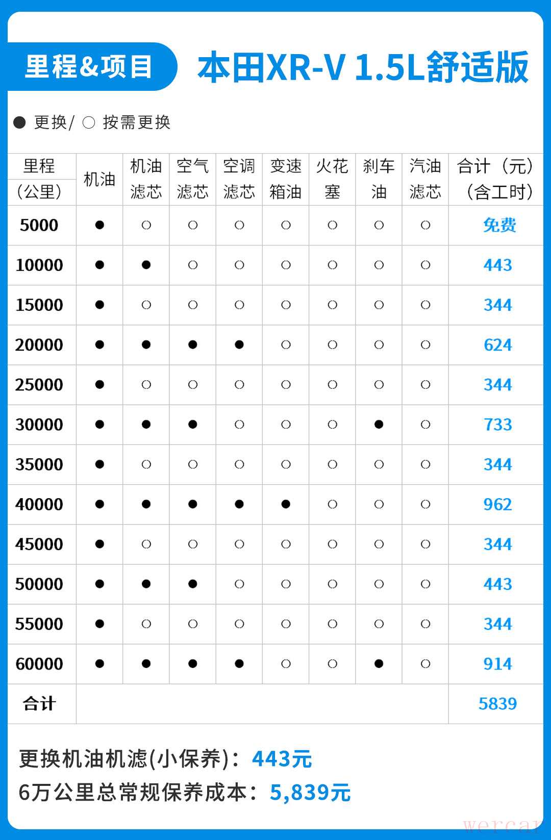 根据厂家建议,本田XR-V的保养周期为5,000公里或者6个月(以先到者为准),其中更换机油、机滤的小保养费用为443元,4万公里大保养的费用为962元。