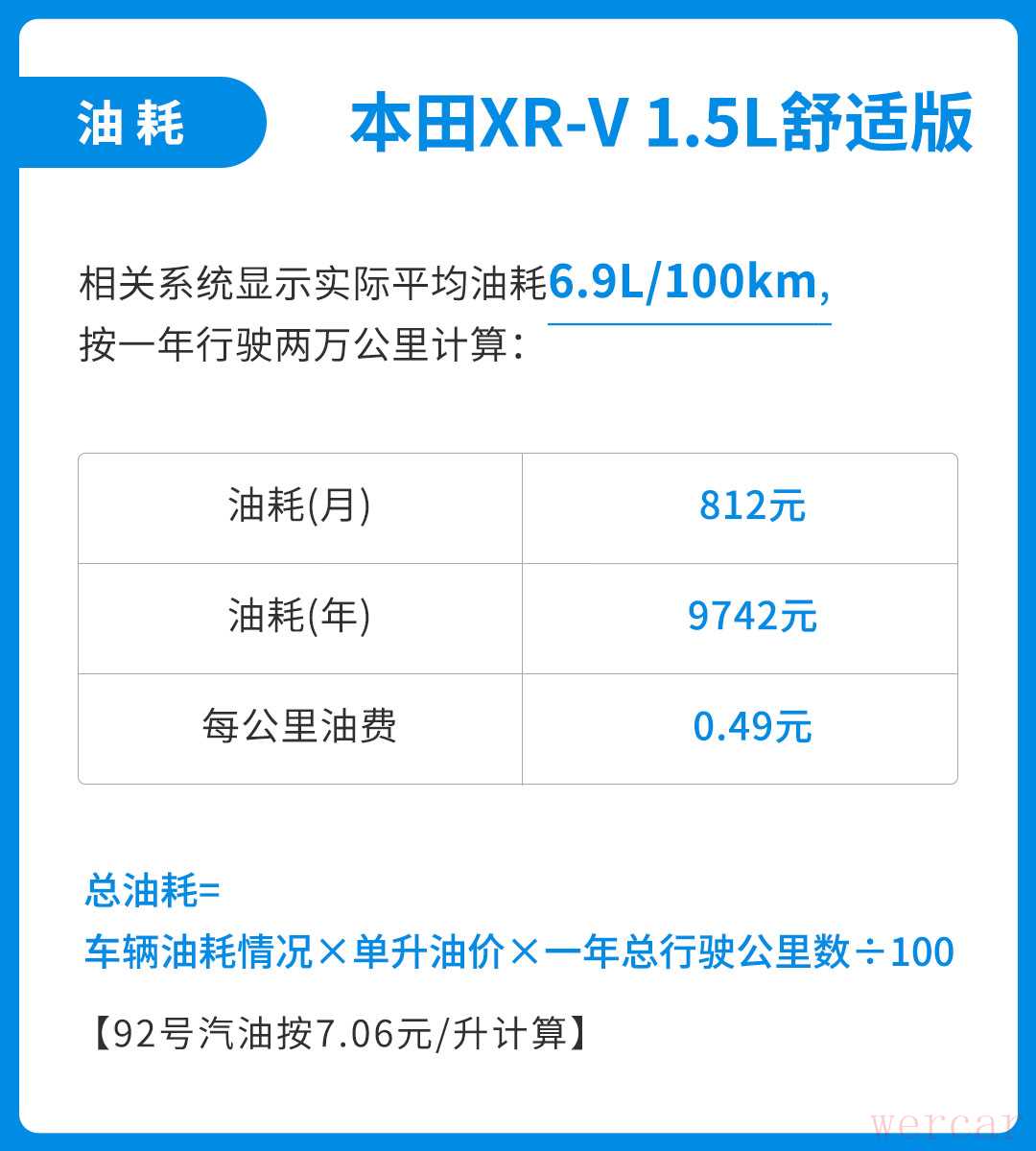 油耗方面,我们从相关渠道了解到,本田XR-V 1.5L舒适版车主的实际平均油耗为6.9L/100km。根据目前广东地区92号汽油7.06元/升的单价计算,1年行驶2万公里的油费为9,742元,没月平均约812元,每公里平均约0.49元。
