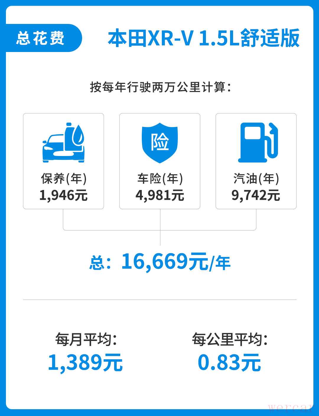 综合来看,本田XR-V 1.5L舒适版每年的固定养车成本为1,946(保养)+4,981(保险)+9,742(油费)=16,669元。每月平均约1,389元,每公里约0.83元。