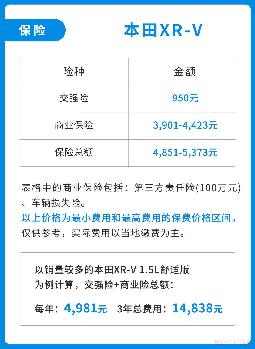 以销量较高的“本田XR-V 1.5L舒适版”为例,一年的保险费用为4,981元。