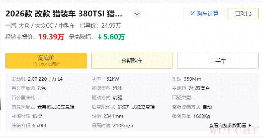 推荐车型:2026改款 猎装车 380TSI 猎心 3000万辆甄选款,指导价为24.99万元。