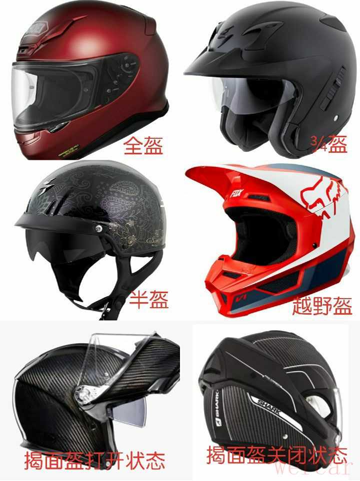 大致可分为全盔,半盔,¾盔,揭面盔,越野盔