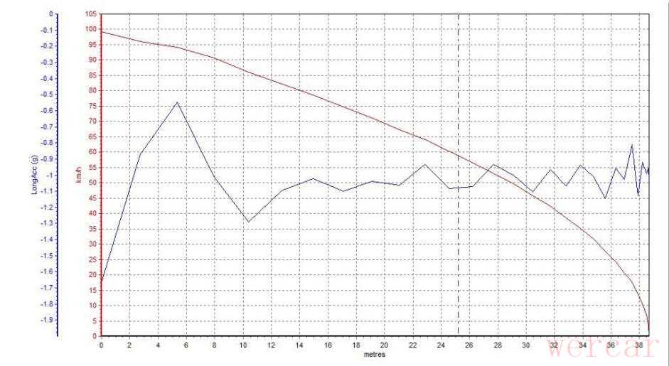 制动力测试上,哈弗F的表现出色,时速100km/h时全力踩下刹车踏板可以清晰的感受到车辆的稳定性,并且整体车身姿态保持出色,很好的抑制住了点头现象,整体的制动力持续性平稳,在经过多次测试后也并未出现明显的衰减,38.56米的测试成绩在同级别车型中属于上游水准。