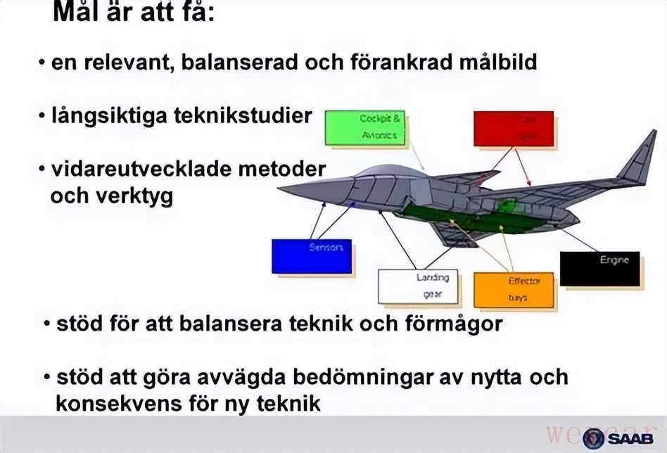 瑞典国防物资管理局 (FMV)对萨博的投资,将用来研发技术验证机,以验证隐身、先进动力系统和下一代航电设备等关键技术。并对下一代战斗机进行详细的概念研究,研究有人、无人作战如何有效协同。