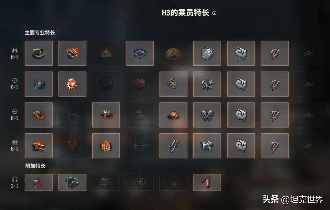 ▲可供参考的乘员技能选择在乘员技能方面,可以参考上图方案进行选择。重型坦克的基础技能就是兄弟连、修理、紧急应对、快速瞄准、炮术大师等技能。除此之外也可以在如履平地、机械达人等技能上进行选择。H3还比较推荐学习短兵相接、炮弹调试、破釜沉舟、快速转弯、精确打击,这都有助于它发挥自己的弹夹特色。