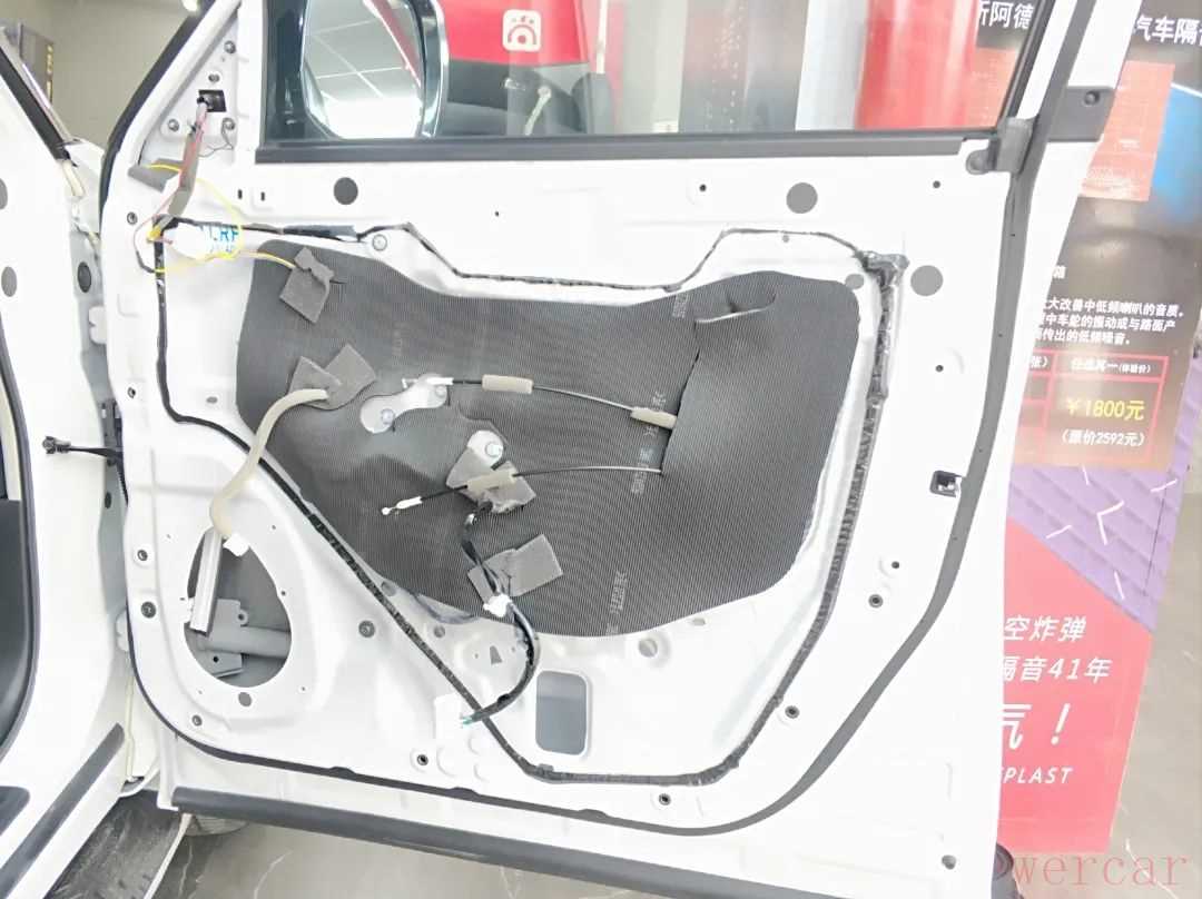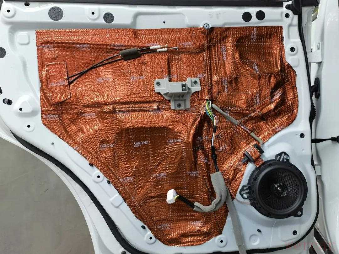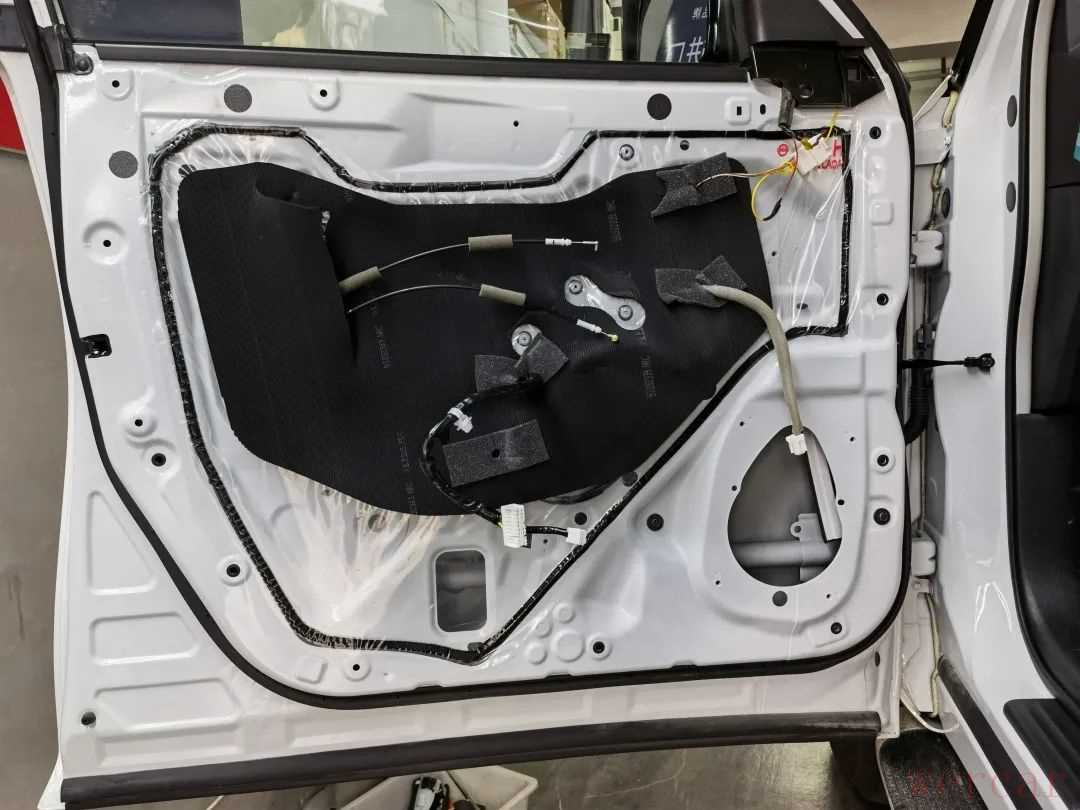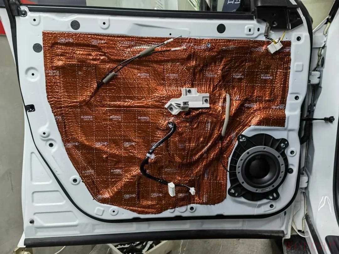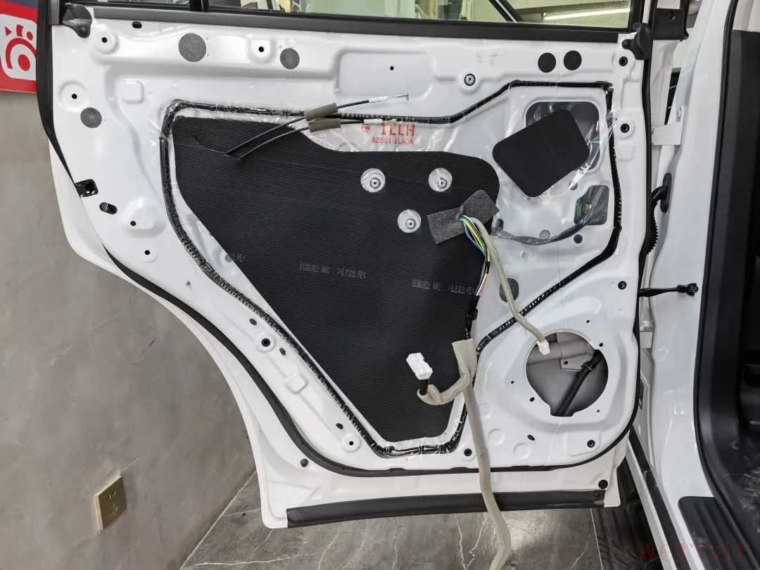 安装声场喇叭前,首先使用俄罗斯阿德萨环保隔音材料对四门进行隔音降噪处理,用隔音材料对车门进行内外双层隔音,增加门板的厚实度,降低外来噪音的传入,提升车内的静谧性,营造一个良好的听音环境。