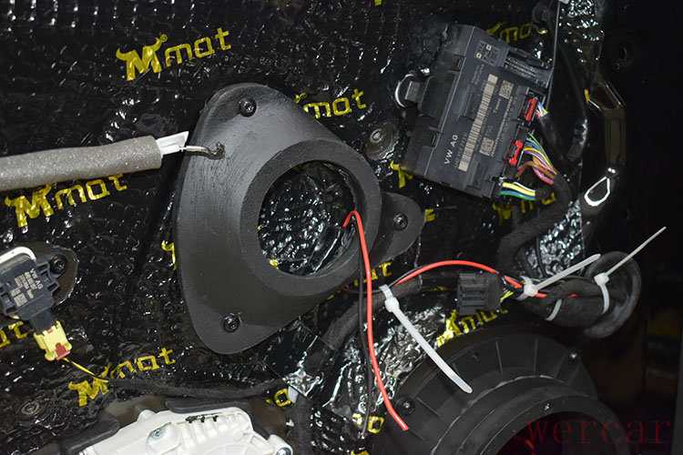 对汽车的门板做了隔音处理之后,改装师在中音喇叭位置加装了纯手工喇叭垫圈,主要目的是降低共振,安装中音喇叭的时候更结实牢固不变形,防止喇叭松动。这样就可以从安装方式上保证喇叭音效不受影响,如果喇叭直接安装在车门门板上,很容易引起共振的。