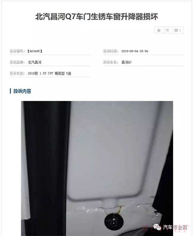 一位2018款1.5T CVT精英型的北汽昌河Q7车主在第三方汽车投诉网站反映道,“4个车门有3个门已生锈,车窗升降器也坏了”。