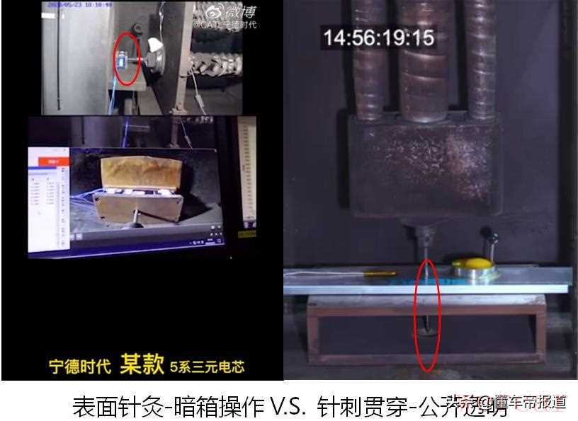 猛听起来,这和宁德时代声称自己通过三元锂电池针刺试验时,上演了相同的情节——在宁德时代发布的视频中,套着强硬外壳的三元锂电池,愣是把实验用的钢针戳断了。一看三元锂电池完好无损,宁德时代转身就宣布自家产品通过了针刺试验。