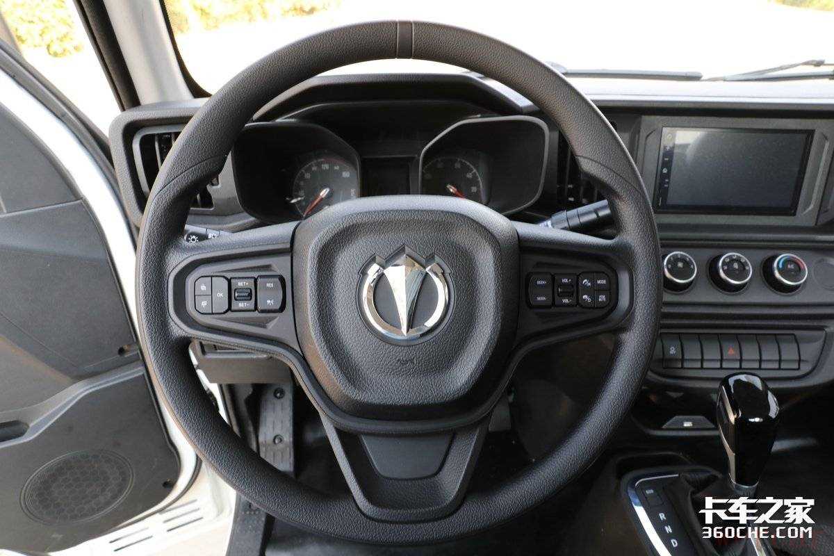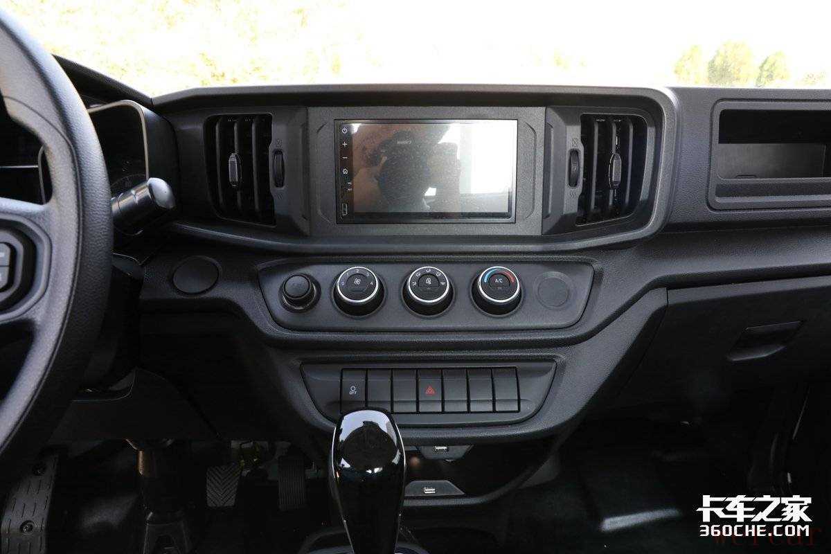 该车中控台是采用对称式设计,最引人瞩目的就是这个中控屏,除了影音娱乐、导航等功能外,还可以通过选装实现四方影像功能,可以说这配置在轻卡车型中都比较少见。而下面的空调控制系统除了常规的旋钮式操作,用户还可以通过手机App进行远程操控,如此以来,无论是酷暑还是寒冬,都可以在上车前将车内调节到宜人的温度。