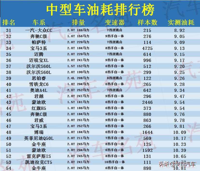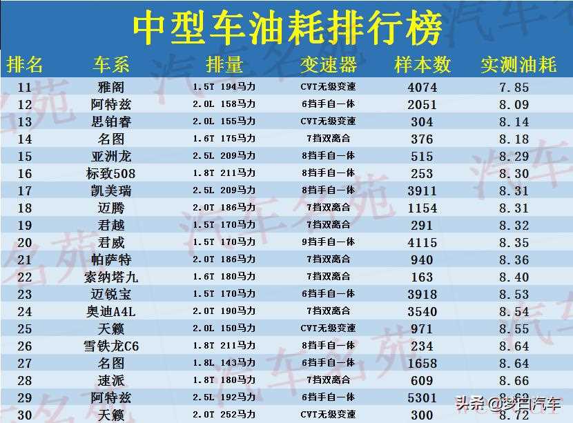 导读:随着国内“二胎”政策的逐步落实,消费者对汽车空间的需求也是越来越高,因此以空间和品质著称的中型轿车(B级),就成为了很多家庭的购车首选!不过,很多消费者对中型轿车的油耗表现比较担忧,所以本期内容就给大家分享最新更新的中型轿车车主实测油耗榜单!让人比较意外的是,大众包揽了前三名,而丰田凯美瑞仅排名第四,雅阁仅排名第八,亚洲龙、天籁和INSPIRE都排名前十。最新!中型轿车油耗排名更新:大众包揽前三,亚洲龙比雅阁省油!