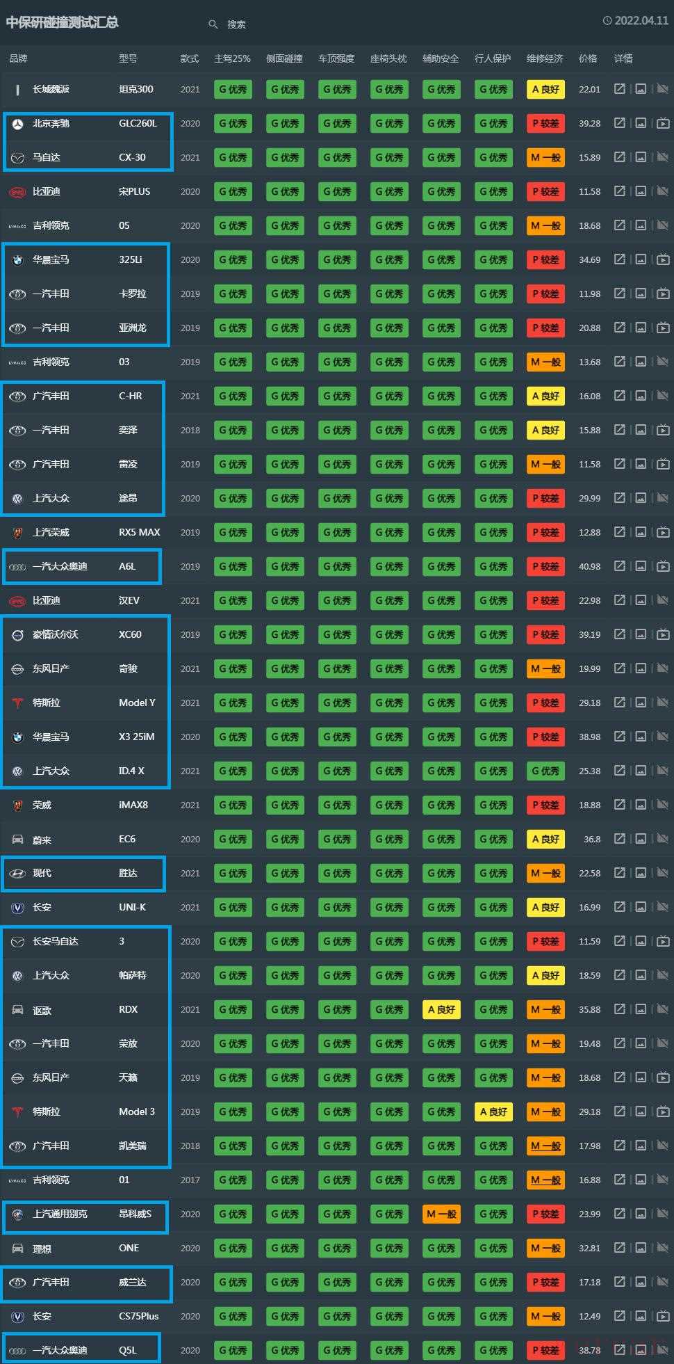 先来看下碰撞测试成绩排名前十的合资车,依次为奔驰GLC、马自达CX-30、宝马3系、丰田卡罗拉、丰田亚洲龙、丰田C-HR、丰田奕泽、丰田雷凌、大众途昂和奥迪A6L,它们的25%主驾碰撞测试、侧面碰撞测试以及车顶强度测试都获得了G级。奔驰GLC、宝马3系和奥迪A6L都属于豪华车型,马自达CX-30、丰田亚洲龙和大众途昂都是中高端车型,它们的品质确实很领先。而丰田车系表现也很亮眼,丰田卡罗拉、丰田C-HR、丰田奕泽和丰田雷凌都是主流合资车,此次入榜前十还是比较令人满意的。