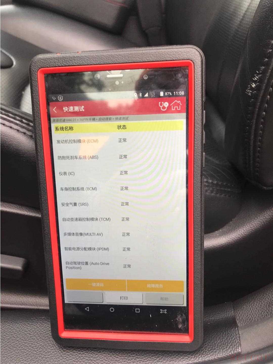 随后进行OBD检查,发现并无异常。检测到此,基本排除了车辆水泡、火烧、座椅翻新、气囊弹出和仪表台翻新的可能性。同时也印证了卖家说的内饰板正是实话。
