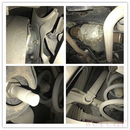 前防撞梁、变速箱托架固定螺丝无拆卸痕迹,方向机两侧防尘套有油迹渗出,后期可以更换防尘套解决。四个轮毂存在不同程度的剐蹭,四条轮胎老化且有偏磨的现象。前后刹车片厚度适中,暂时无需更换。检测到此,车辆基本可以排除了前后出现大事故的可能性。