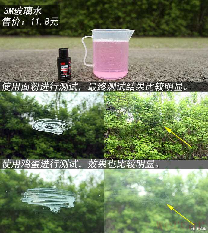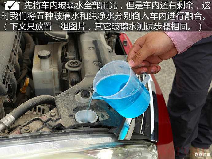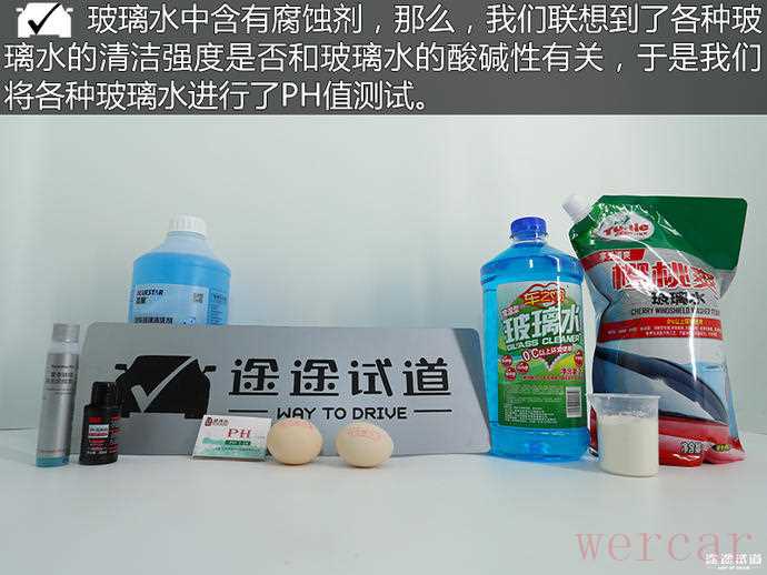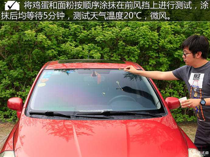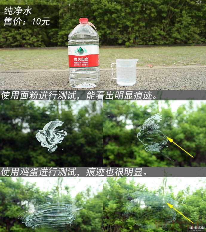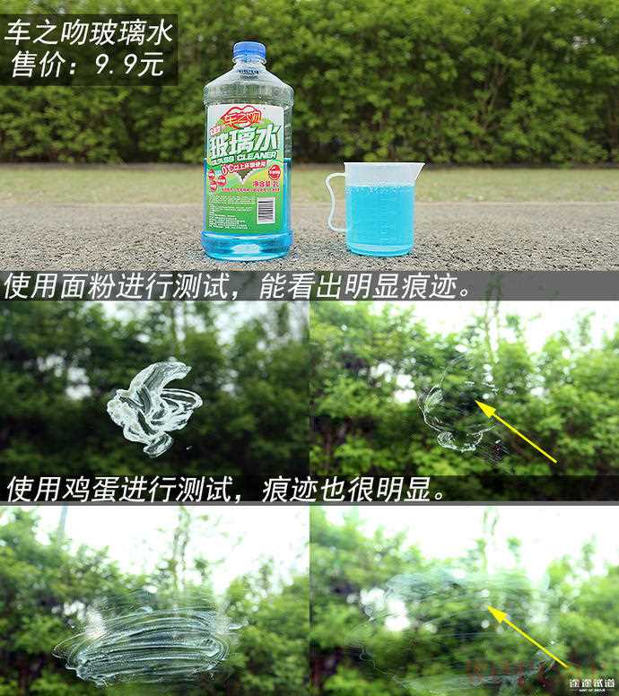 测试简介:此次我们选择市面上最为常见的玻璃水,其中包括蓝星、龟牌、3M浓缩、车之吻,另外还有奔驰4S店使用的浓缩玻璃水和桶装纯净水,多种颜色的玻璃水和纯净水进行测试,向前风挡涂抹鸡蛋和面粉最难清除的两种液体,看看各种玻璃水的清洁能力,因此选择鸡蛋是因为鸡蛋中含有蛋白质,而高速蚊虫也含有大量的蛋白质,而面粉更加接近尘土,因此选择鸡蛋和面粉,好了,下面就来看看测试结果吧。