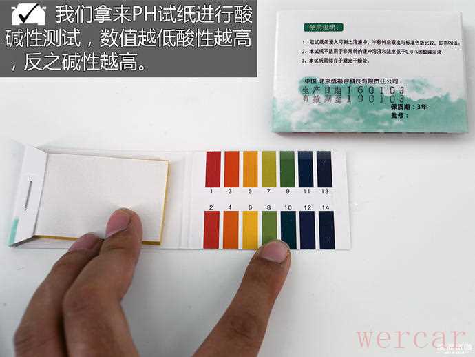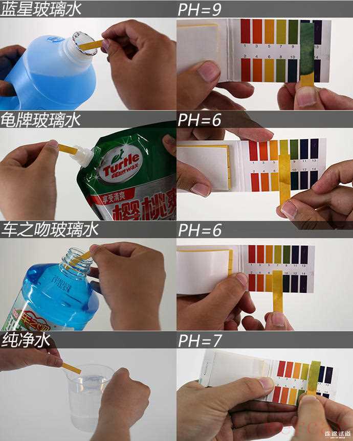 在测试之前我们了解到,国家规定PH值在6.5-10之间都属于合理范围之内,因此我们的测试结果能够看出几款玻璃水分别PH值都在6、7区间,数值越小酸性越大,因此这几款玻璃水都呈中性,其中,蓝星玻璃水碱性较大,酸性大的具有一定腐蚀性,极其容易损坏皮管之类的硬件物品,而碱性过大容易产生颗粒,导致皮管堵塞。