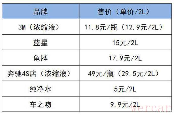 上表为此次测试玻璃水以及纯净水的单价,其中3M玻璃水和奔驰4S店玻璃水为浓缩液,需要进行稀释后算出每2L一瓶的单价,之后与其它玻璃水进行性价比对比,3M浓缩液和奔驰4S店浓缩液计算公式如下: