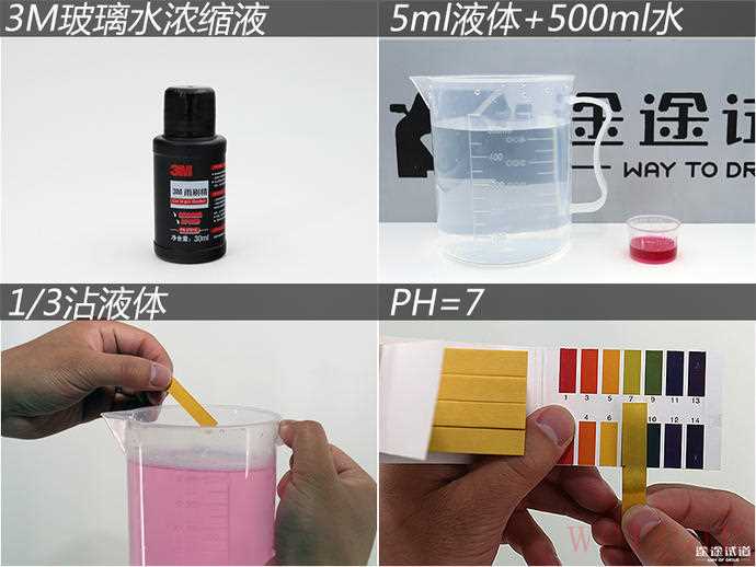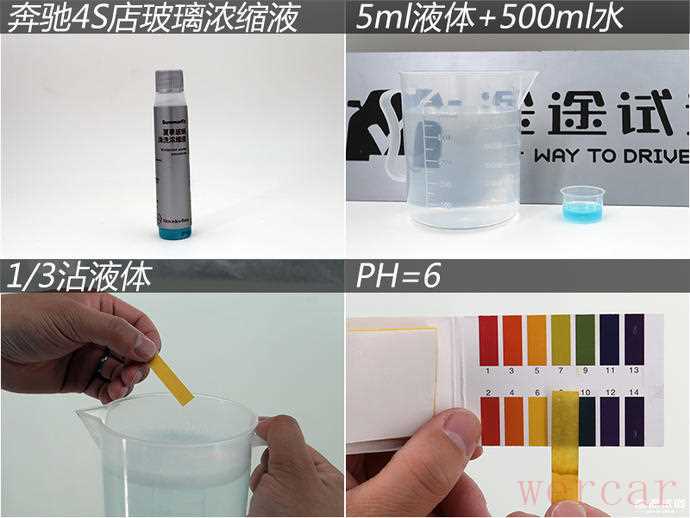 由于奔驰4S店玻璃水和3M玻璃水都是浓缩液,因此我们还需要将它溶解后在进行测试,下面就来看看这两款玻璃水溶解后的酸碱性吧。