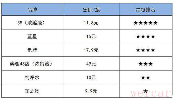 此次测试最终我们按照5颗星进行评价,等级高的评价为5星,3M最终获得5颗星,凭借着清洁能力、单瓶价位和PH测试数值结果比较突出,蓝星和龟牌都是四颗星,车之吻最大的弱点就是清洁能力,纯净水在日常临时可以使用,但是只是临时,因为没有添加任何腐蚀剂,所以可以说实际效果可以忽略不计。